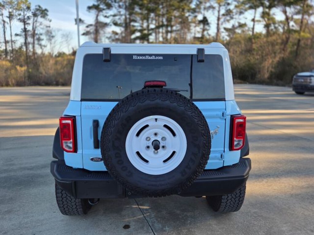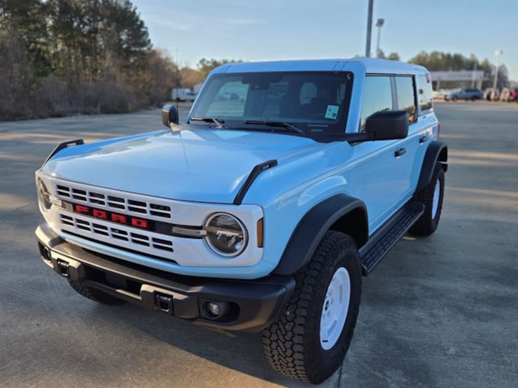 Blue 2025 Ford Bronco Heritage Edition 4WD 10-Speed Automatic 2.7L EcoBoost V6 LOCAL TRADE, NON SMOKER, DETAILED, OIL CHANGE, NEW TIRES, NEW BRAKES, APPLE CARPLAY, ANDROID AUTO, 4-Wheel Disc Brakes, 7 Speakers, ABS brakes, Air Conditioning, Alloy wheels, AM/FM radio: SiriusXM with 360L, AM/FM Stereo, Auto High-beam Headlights, Auto-dimming Rear-View mirror, Automatic temperature control, Brake assist, Compass, Connected Navigation, Convertible HardTop, Convertible roof lining, Delay-off headlights, Driver door bin, Driver vanity mirror, Dual front impact airbags, Dual front side impact airbags, Electronic Stability Control, Emergency communication system: 911 Assist, Equipment Group 662A Mid Package, Exterior Parking Camera Rear, Front anti-roll bar, Front Bucket Seats, Front Center Armrest, Front dual zone A/C, Front fog lights, Front reading lights, Front wheel independent suspension, Fully automatic headlights, Glass rear window, Heated door mirrors, Heated front seats, Heated steering wheel, Illuminated entry, Integrated roll-over protection, Internet access capable: FordPass Connect, Leather Shift Knob, Low tire pressure warning, Navigation system: Connected Navigation, Occupant sensing airbag, Outside temperature display, Overhead airbag, Overhead console, Panic alarm, Passenger door bin, Passenger vanity mirror, Plaid Cloth Front Heated Bucket Seats, Power door mirrors, Power steering, Power windows, Radio data system, Rear window defroster, Rear window wiper, Remote keyless entry, Security system, SiriusXM w/360L, Speed control, Split folding rear seat, Steering wheel mounted audio controls, SYNC 4, Tachometer, Telescoping steering wheel, Tilt steering wheel, Traction control, Trip computer, Variably intermittent wipers, Wheels: 17" Unique White.